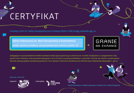 Szkoła Podstawowa w Kostomłotach od samego początku aktywnie uczestniczy w tym projekcie. W tym roku szkolnym dwukrotnie uczniowie mogli się zmierzyć z zadaniami konkursowymi. W związku z sytuacją pandemiczną we wrześniu odbyła się edycja XIII. Hanna Janiec zdobyła II nagrodę, zaś Wiktoria Janiec i Alicja Wasylów wyróżnienia.