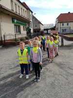 Pierwszoklasiści poznają znaki drogowe, spacerując ulicami Kostomłotów.