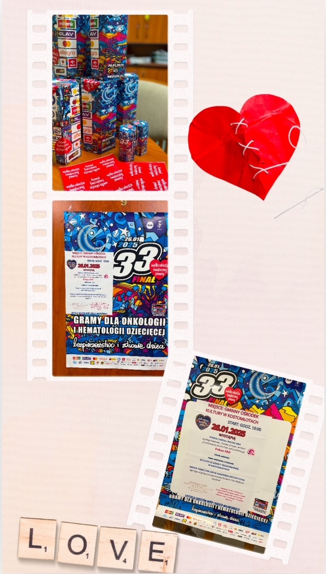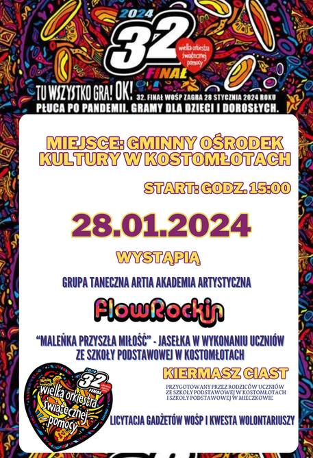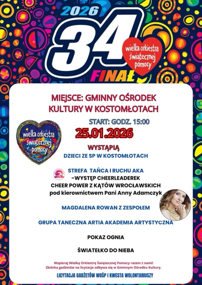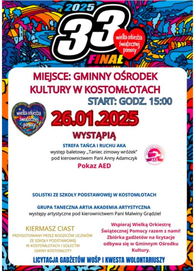 26 stycznia 2025r. dwudziestu jeden wolontariuszy od wczesnych godzin rannych ruszyło w teren. O godz. 15:00 do Gminnego Ośrodka Kultury w Kostomłotach tłumnie przybyli mieszkańcy Gminy Kostomłoty, aby podziwiać występy dzieci z grupy tanecznej oraz uczniów ze Szkoły Podstawowej im. Marii Konopnickiej w Kostomłotach. Jako pierwsi na scenie wystąpili młodzi tancerze z grupy Artia Akademia Artystyczna oraz Strefa Ruchu i Tańca AKA. Ich barwne stroje i niezwykłe umiejętności zachwyciły widownię. W przerwie można było skosztować wypieków przygotowanych przez rodziców uczniów SP w Kostomłotach oraz sołectw z terenu gminy. Jednym z punktów programu była prezentacja zdolności muzyczno- wokalnych uczniów z SP w Kostomłotach.