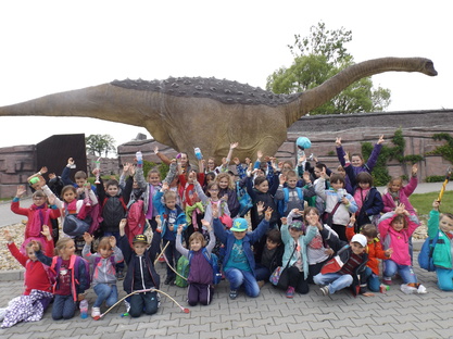 Dnia 21.05.2015 klasy I ze Szkoły Podstawowej w Kostomłotach udały się na wycieczkę do zaczarowanego i bardzo ciekawego miejsca - Parku Dinozaurów w Krasiejowie. Celem wycieczki było zwiedzanie pawilonu paleontologicznego i JuraParku, poznanie prehistorycznego świata dinozaurów, dostrzeżenie zmienności gatunków, poszerzenie zakresu zainteresowań dzieci. To tutaj poznaliśmy życie na Ziemi przed milionami lat, byliśmy świadkami powstania pierwszych galaktyk i Układu Słonecznego oraz przyglądaliśmy się narodzinom Ziemi, powstaniu atmosfery i pierwszym formom życia. Następnie spacerowaliśmy wśród prehistorycznych stworzeń po specjalnie przygotowanej ścieżce edukacyjnej, którą przemierzyliśmy poszczególne okresy ery dinozaurów, poznając ich życie i zwyczaje. Kolejnym punktem tak bogatego programu zwiedzania były warsztaty paleontologiczne, które sprawiły dzieciom wiele radości, a zwłaszcza niespodzianka ukryta w gipsowym jajku. JuraPark miał do zaoferowania nie tylko naukowe fakty, ale również niezwykły plac zabaw oraz wesołe miasteczko które wszystkich zachwyciło. Nie zabrakło również chwili na pyszny posiłek oraz zrobienie zakupów na stoiskach z pamiątkami, bo kto nie chciałby przywieść ze sobą dinozaura. Po tak bogatej ofercie edukacyjnej , wypoczynku i zabawie, dzieci pełne wrażeń wróciły bezpiecznie autokarem do domu.